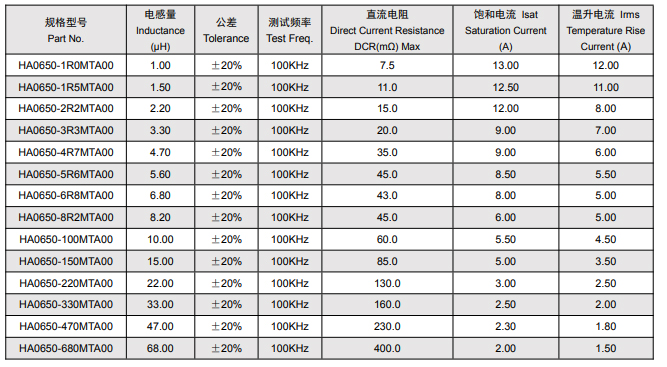 HA0650系列功率电感型号:
