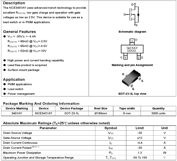 锂电池保护板一般选用30VMOS管,在这里给大家介绍下新洁能的增强型P沟道MOS管:NCE3401AY那么为何选用新洁能的NCE3401AY呢?球信网·(中国)电子给大家分享下NCE3401AY的规格书,顺带给大家解答: