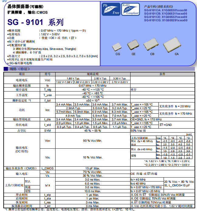 大家好,今天给大家介绍扩展频率中的SG-9101CESG-9101CE是一款小尺寸3225。随着市场小型化、多功能、高信赖度的电子产品需求量大增,产品开发周期时间要求越来越短,传统的石英晶振性能优异,但设计制造周期相对较长,如果有工程师因为项目急需特殊频点,特殊封装的晶振产品用于设计测试,很有可能无法短期内获得对应频点的样品而可能耽误设计周期,影响项目交付进度。扩展频率晶振的出现极大的解决了工程师对新产品晶振的实时变更需求。SG-9101CE内置一个高稳定的有源晶振(基频),利用PLL技术,配合对应的工具软件及外置的编程器方便的调整分频/倍频参数,并在线烧录,几分钟就定制成一个客户所需的全新晶振。这样就大大节省了客户的等待时间,实时提供样片供用户测试。另外对于用量相对较小的用户,可以采取这种方式批量生产,极速交付。SG-9101系列可以分为: SG-9101CA 7050  SG-9101CB 5032 SG-9101CE 3225 SG-9101CG 2520 ,而其中SG-9101CE是小尺寸3225有源晶振同时也是销量很高的一款扩展频率晶振。SG-9101CE频率可编程范围0.67MHz~170MHz(每步1ppm),扩展频率范围±0.25%~±4%。SG-9101CE新品提供更宽广的操作温度范围,及降低50%的消耗电流。SG-9101CE扩展频率晶振的消耗电流比现行量产品更大幅降低了75%。SG-9101CE的扩展频率晶振提供几种类型的调制方式,可以实现б值为±0.5%、±0.75%、±1%、±1.5%、±2%和0.25%的调制,实践证明引入扩展频率晶振调制引入的时钟信号抖动很小。SG-9101CE通过动态改变时钟频率,有效降低d电磁辐射功率,减少EMI电磁干扰的影响,球信网·(中国)电子依然给大家提供SG-9101CE规格书以供大家选型参考: